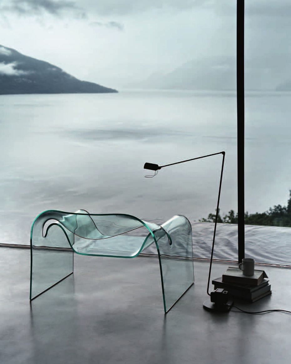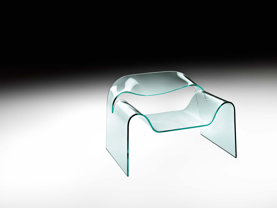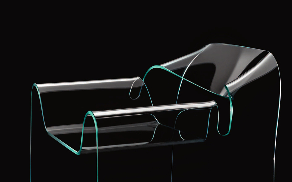 Ghost, una seduta che non si vede, cioè trasparente, che grazie alla monoliticità e all'invisibilità si distingue dalle altre fantasiose poltrone. Tutto merito del vetro, sicuro, affidabile: un solo foglio spesso 12 mm che, piegato e tagliato, forma contemporaneamente la seduta, i braccioli, lo schienale.